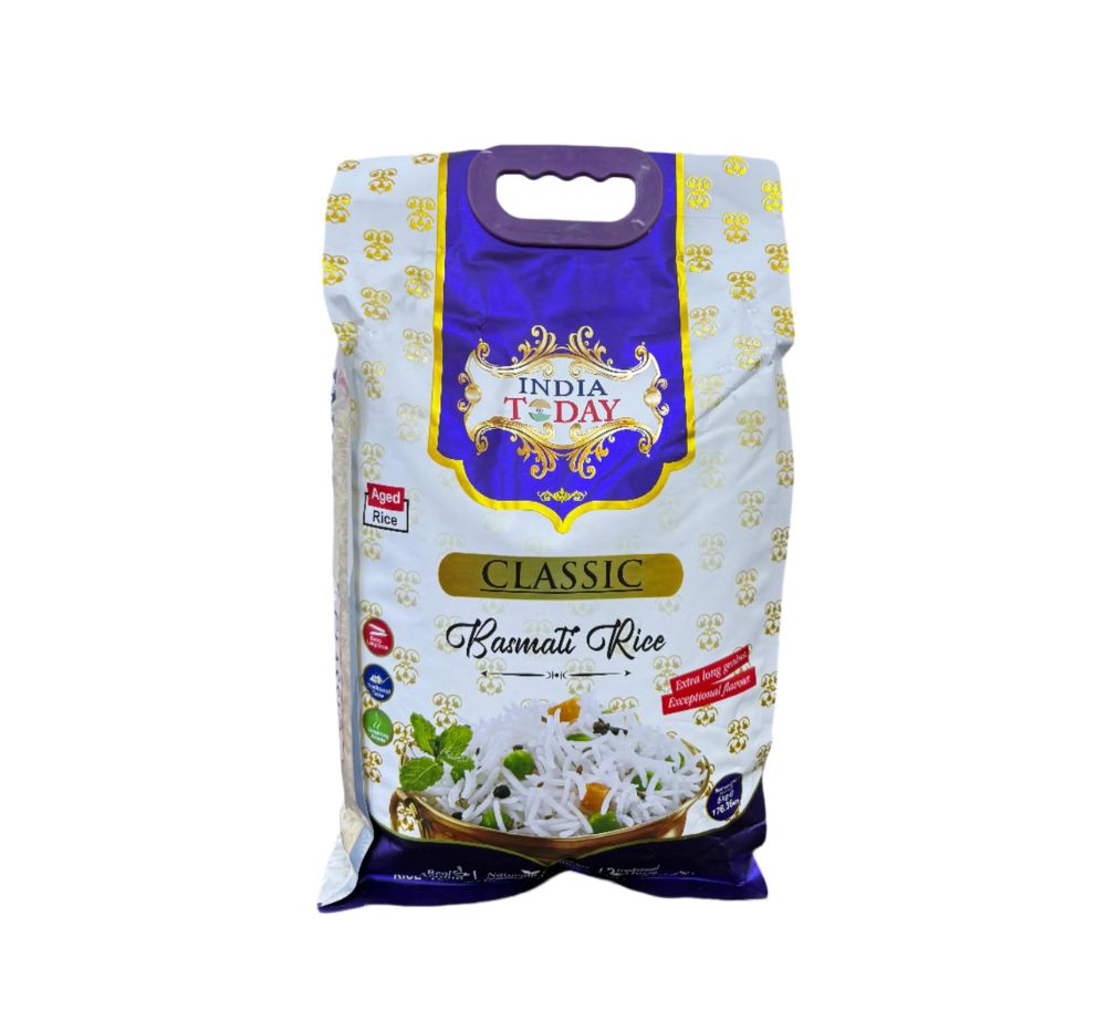 India Today Classic Basmati Rice 5kg — timeless long-grain basmati rice with a classic natural aroma, fluffy separate grains, and authentic flavour. A versatile all-rounder perfect for everyday dal chawal, curries, biryani, and pulao. Consistent classic quality in a convenient 5kg pack.